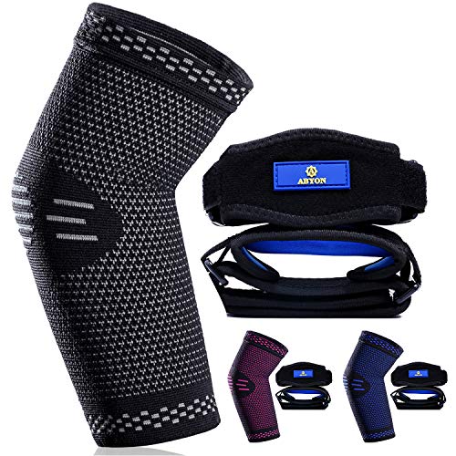 Two tennis elbow straps and one elbow compression sleeve are what you get with the Abyon Elbow Compression Arm Support for a budget-friendly price.
