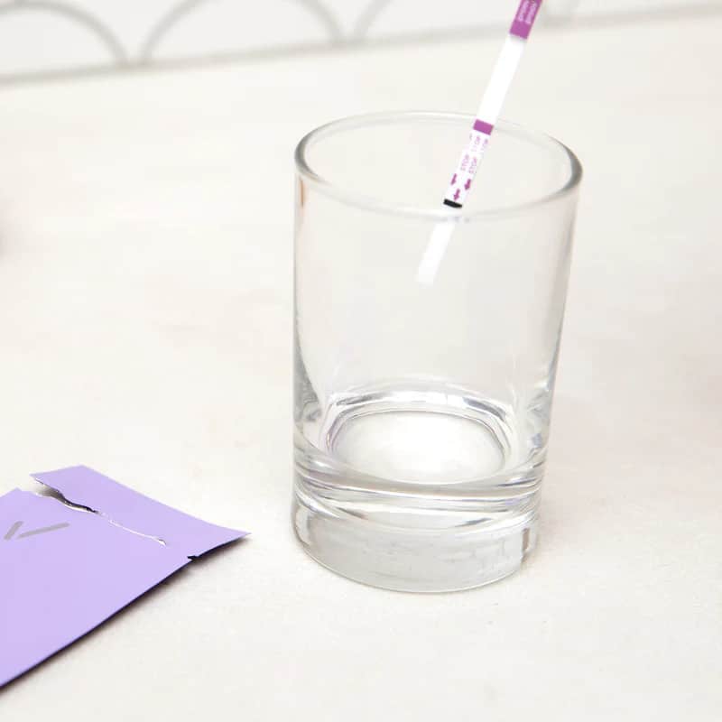 - Dip the absorbent tip of the PdG test strip into your urine sample for 5 seconds.